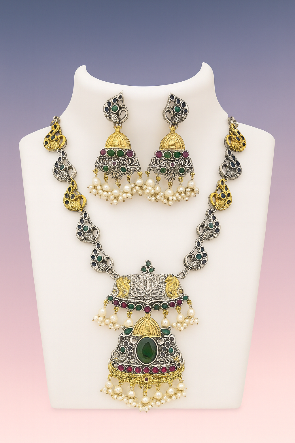 This stunning Regal Heritage Temple Necklace Set captures the grandeur of traditional South Indian jewelry. Handcrafted in oxidized silver with antique gold accents, it features intricate motifs inspired by temple architecture. Embellished with vibrant green and ruby stones, the centerpiece showcases a detailed design adorned with pearl clusters for a touch of royal elegance. The matching jhumka earrings complete the look, making it a perfect choice for weddings, cultural celebrations, and festive occasions.