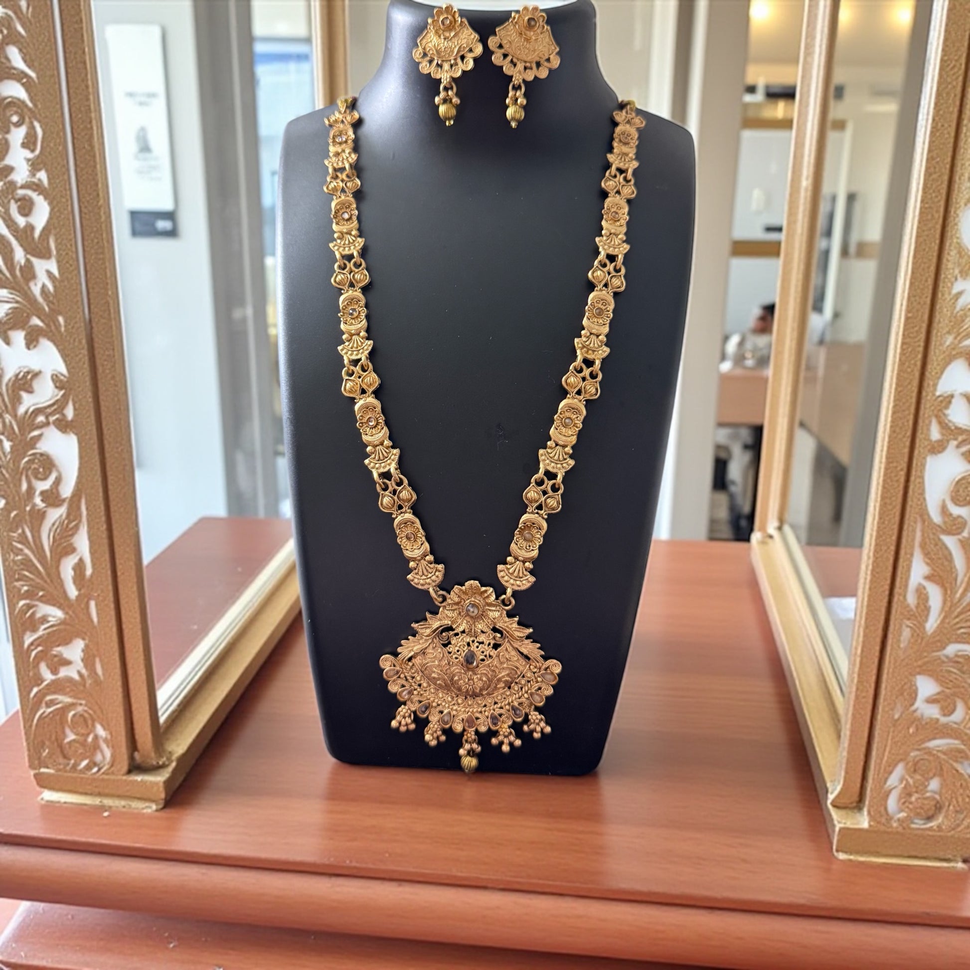 Radiating divine charm, the Golden Blossom Temple Set features a stunning antique gold necklace with intricate floral motifs and delicate hanging beads. The beautifully carved pendant reflects traditional temple artistry, complemented by matching earrings that complete the look. Perfect for festive occasions, weddings, and cultural celebrations, this set adds a touch of heritage luxury to your style.