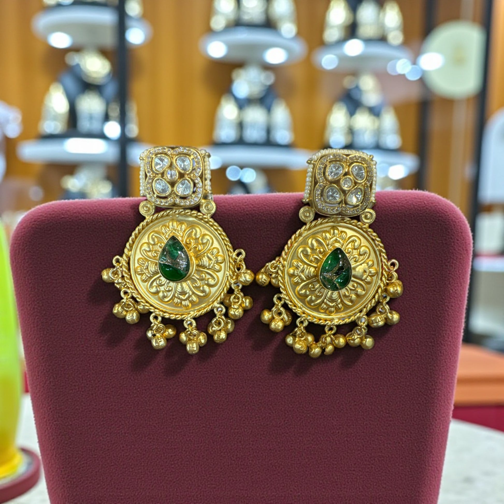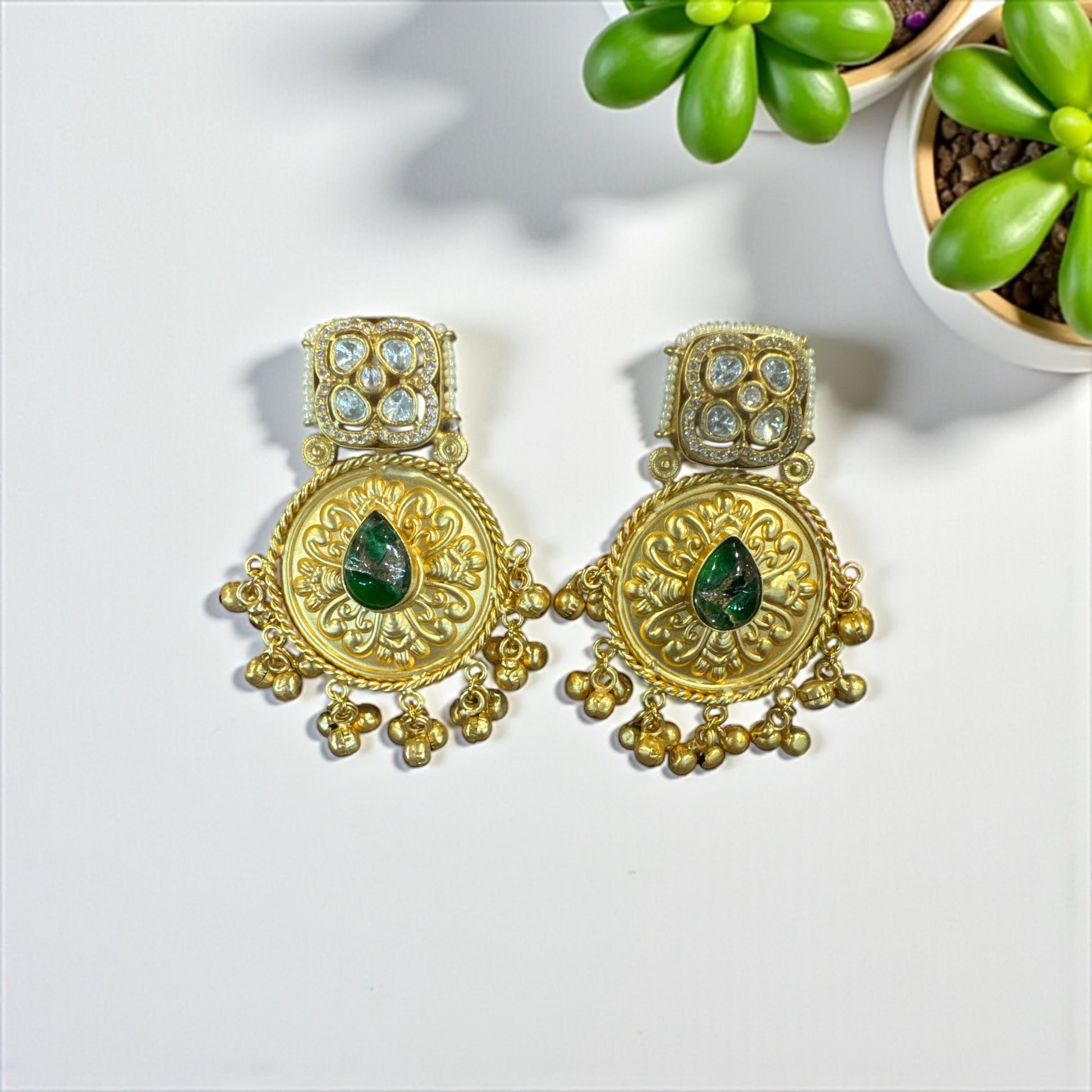 Radiating regal charm, these gold-plated earrings feature a traditional circular motif centered with an emerald-green teardrop stone. The intricate Kundan detailing and dangling gold beads add richness and elegance, making them perfect for weddings, festivals, and grand celebrations.