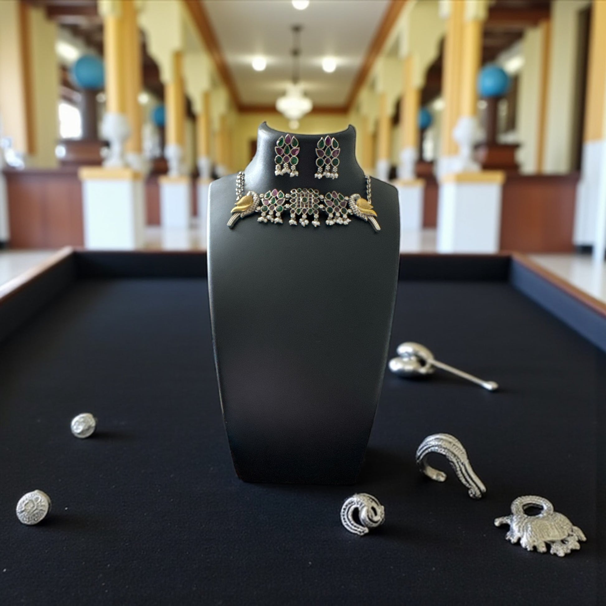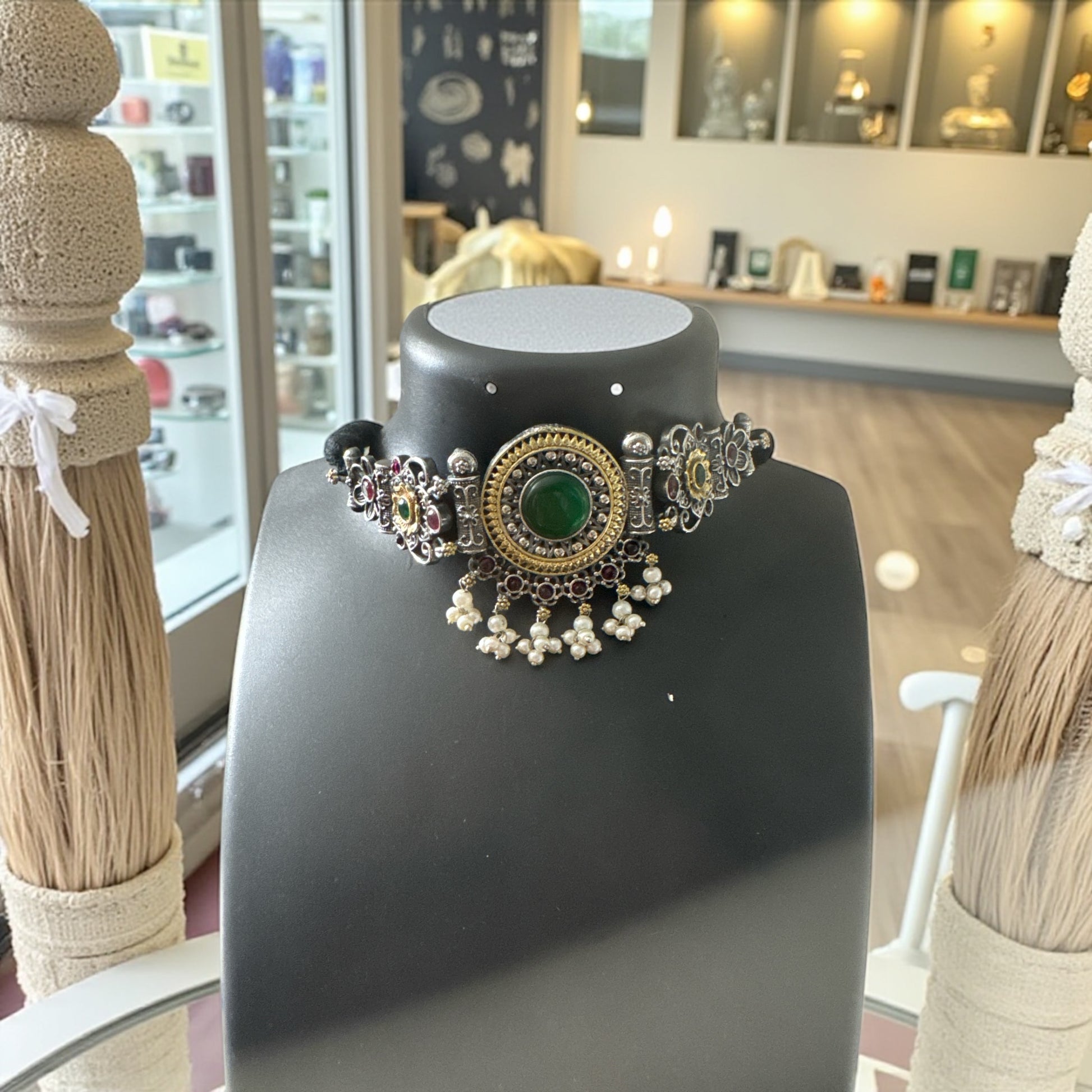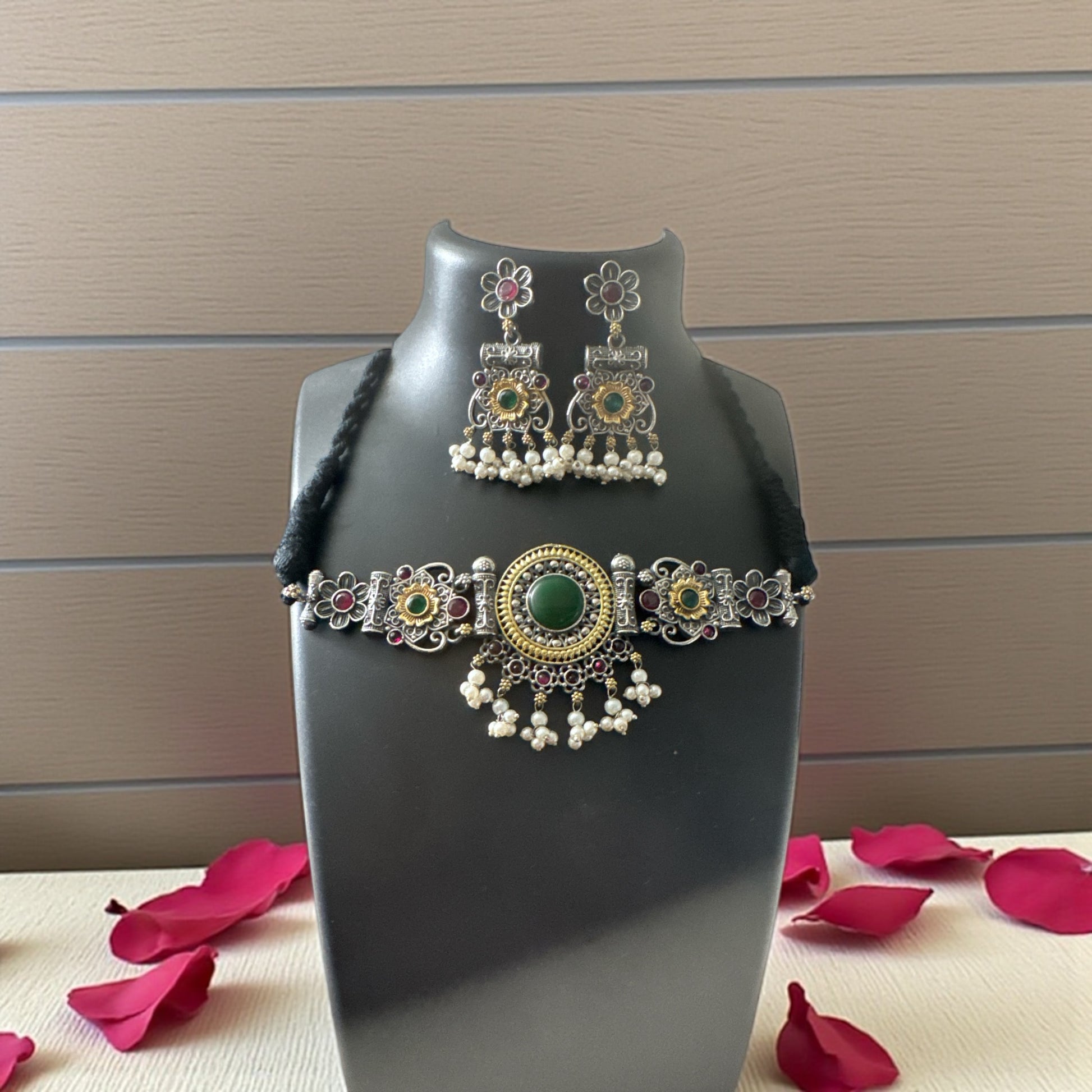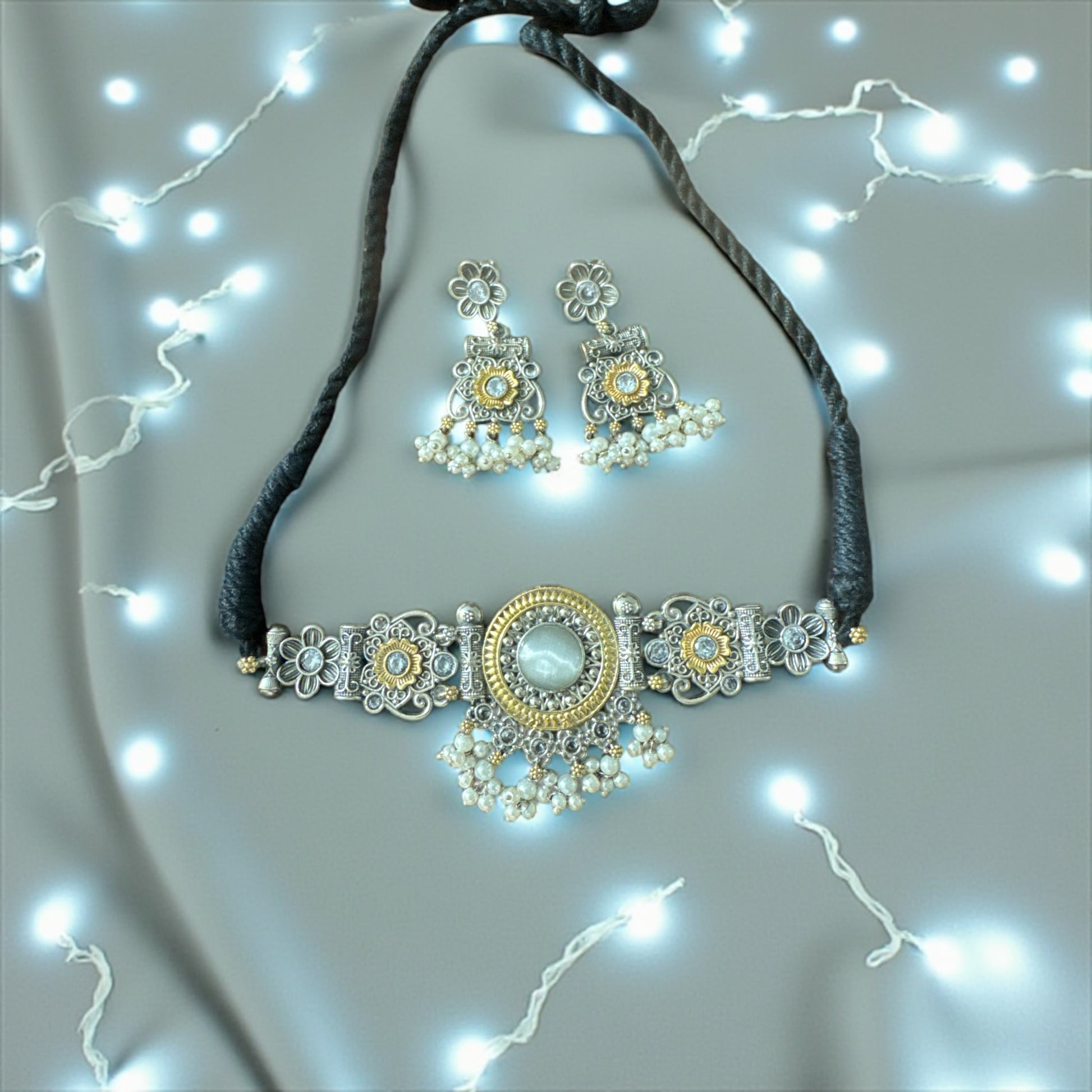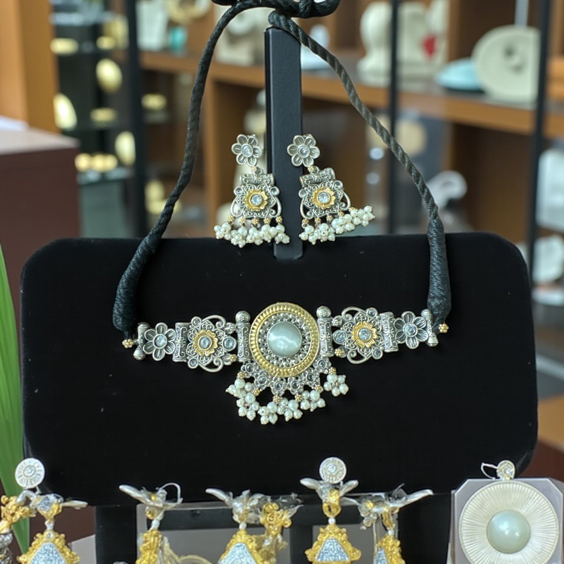 Radiating celestial beauty, the Moonlit Bloom Choker Set captures the perfect harmony of elegance and tradition. Crafted in dual-tone silver and gold, the choker features intricate floral motifs surrounding a luminous moonstone centerpiece. The delicate pearl drops and matching earrings add a soft, graceful charm ā ideal for festive nights, weddings, and royal celebrations.