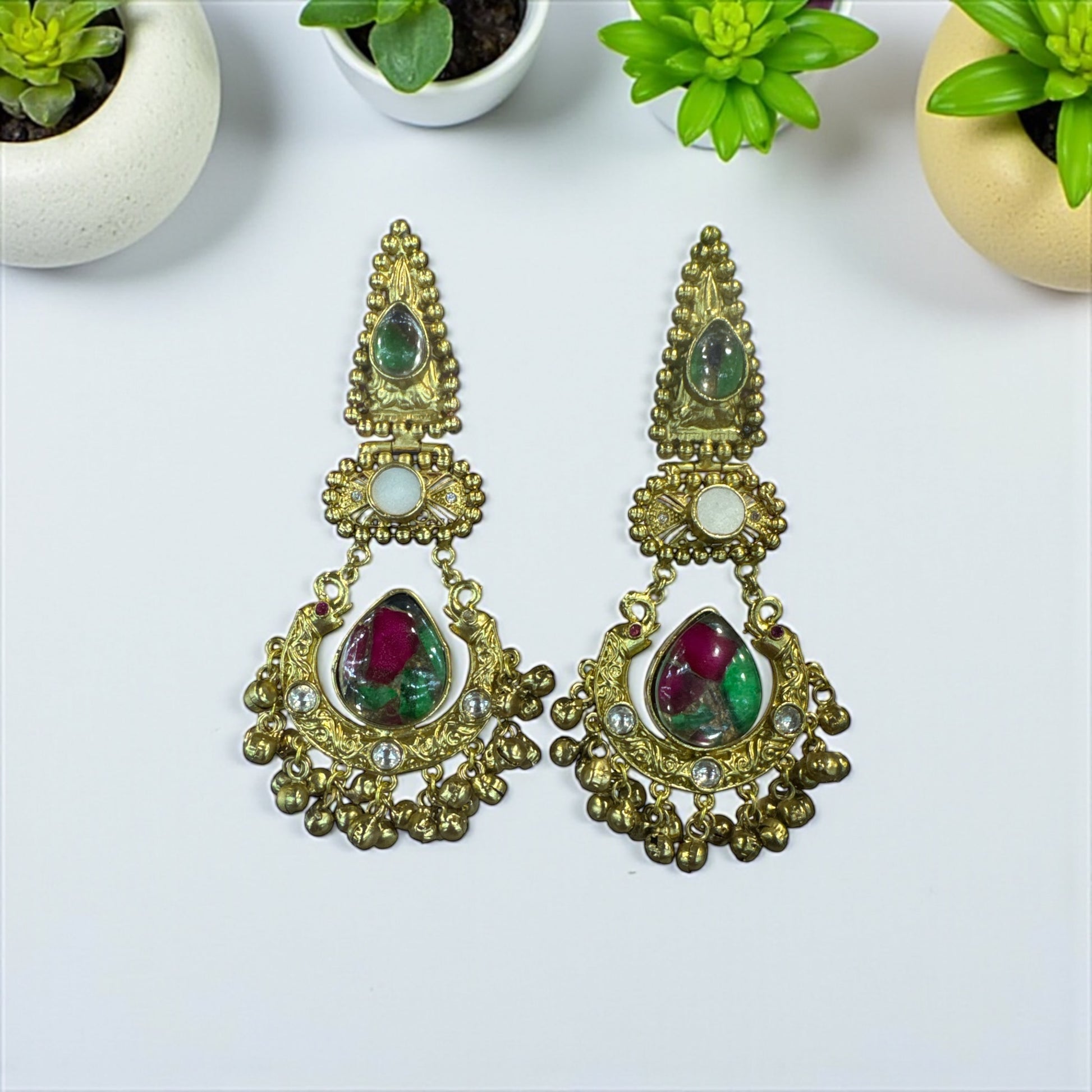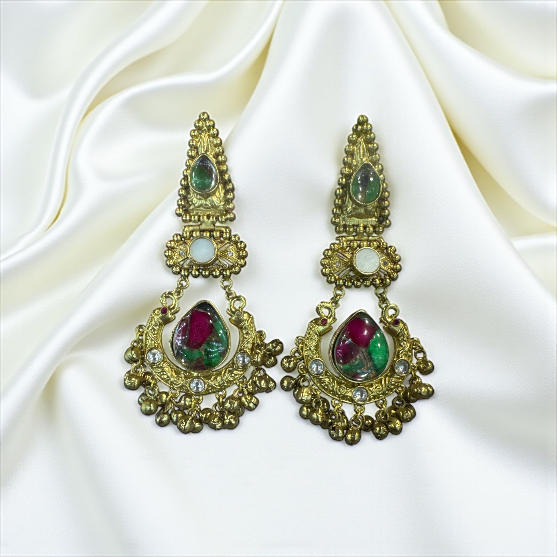 These luxurious handcrafted earrings feature a stunning mix of ruby and emerald tones encased in gold-plated detailing. The crescent-shaped base is adorned with intricate Kundan work, white crystal accents, and traditional ghungroo drops. Perfect for weddings, festive occasions, or elegant traditional wear, these earrings radiate royal sophistication.