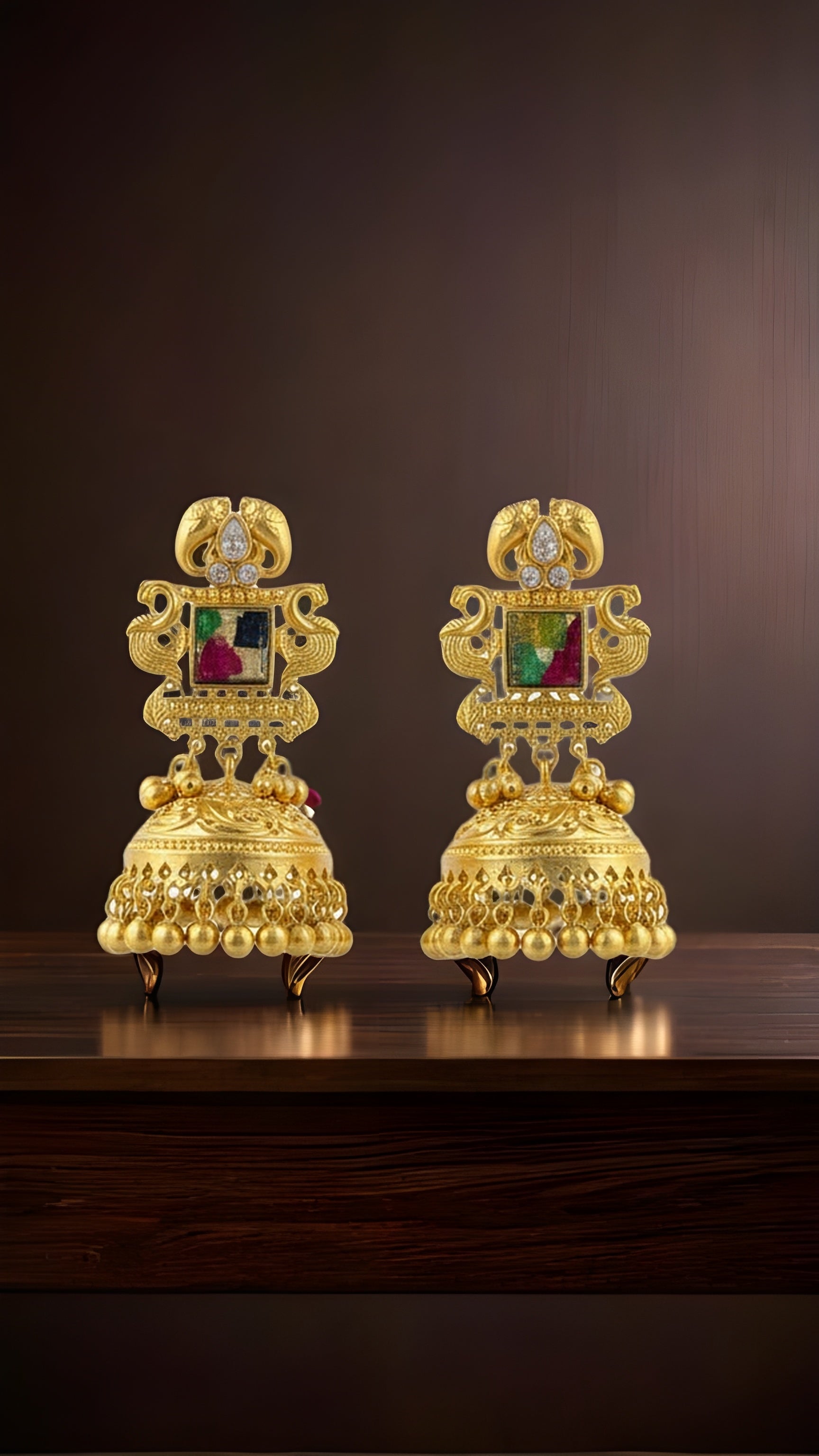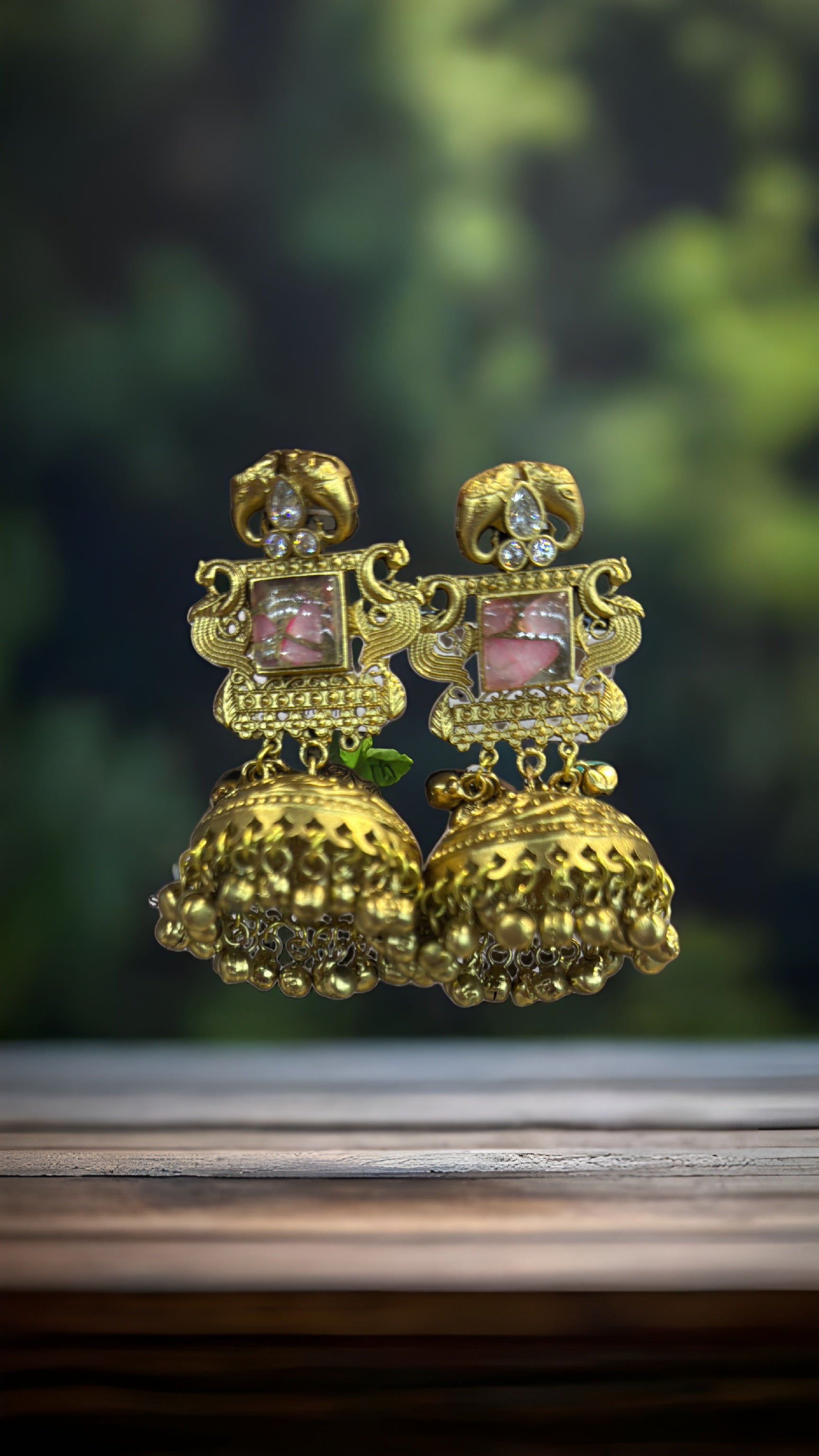 These Royal Pink Temple Jhumka Earrings embody the richness of traditional Indian craftsmanship. Designed with antique gold detailing, the earrings feature intricate peacock motifs framing soft pink gemstone squares, creating a perfect harmony of grace and grandeur. The ornate jhumka bells are adorned with tiny golden beads that add a classic festive charm. Ideal for weddings, cultural celebrations, or special occasions, these earrings are a timeless statement of heritage and beauty.